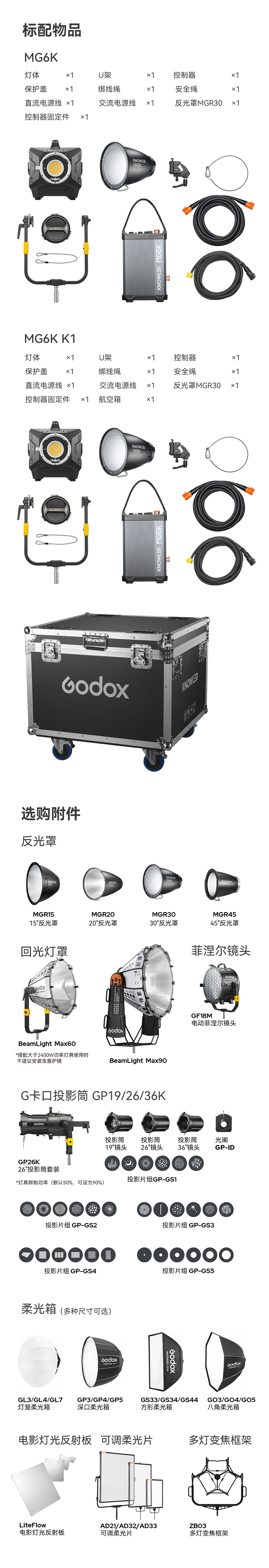 MG6K作为神牛G卡口的新成员,可直接共享神牛G卡口完备附件生态(反光罩除外),以神牛光学系统打造独特光学特效。秉持用户至上的理念,神牛不断拓展附件生态的深度和广度,研发如GL7超大球形柔光罩、电动三灯支架、回光灯罩、电动菲涅尔等新型附件,为MG6K带来丰富多样的塑光效果。